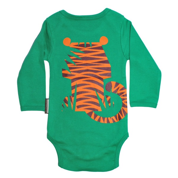 This set will make a wonderful baby boy gift. The clothes are made in beautiful organic cotton. It comes in a handy size 12-month as mums tend to get a lot of clothes in newborn size. Having a bodysuit paired with a bib make it a great present for future happy eater. The bodysuit front displays the front of the tiger in a beautiful jungle scene whilst the back shows the reverse of tiger with his stunning long tail. The yellow cardboard suitcase makes a great packaging for these wonderful presents.