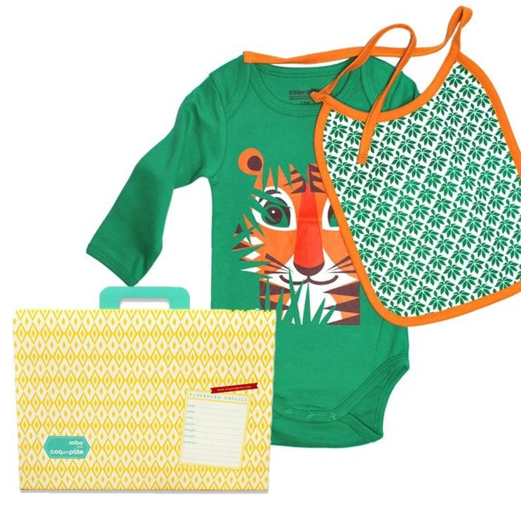 Baby gift set: organic cotton matching bodysuit, bib and suitcase – Tiger